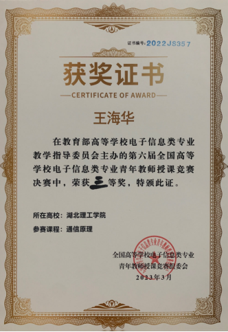 2023年3月24日—26日,第六届全国高等学校电子信息类专业青年教师授课竞赛决赛暨专业建设研讨会在重庆邮电大学举行。电气学院王海华和叶天凤两位老师参加了此次会议。王海华老师讲授的《通信原理》课程,在预赛中获得华南赛区二等奖,在本次决赛中荣获全国三等奖;这是继2022年严伟老师获得电工电子实验教学竞赛全国三等奖之后,电气学院青年教师获得的又一个国家级教学竞赛奖。