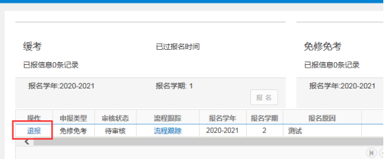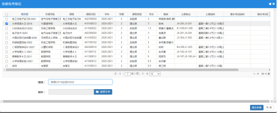 弹出以下界面后,勾选需要免修的课程,填写原因,在附件中上传免修支撑材料后提交,由开课教学院(部)——教务处审批,学生可通过“流程跟踪”中查看审核过程。如操作错误,可在审核通过前,点击“退报”课程。