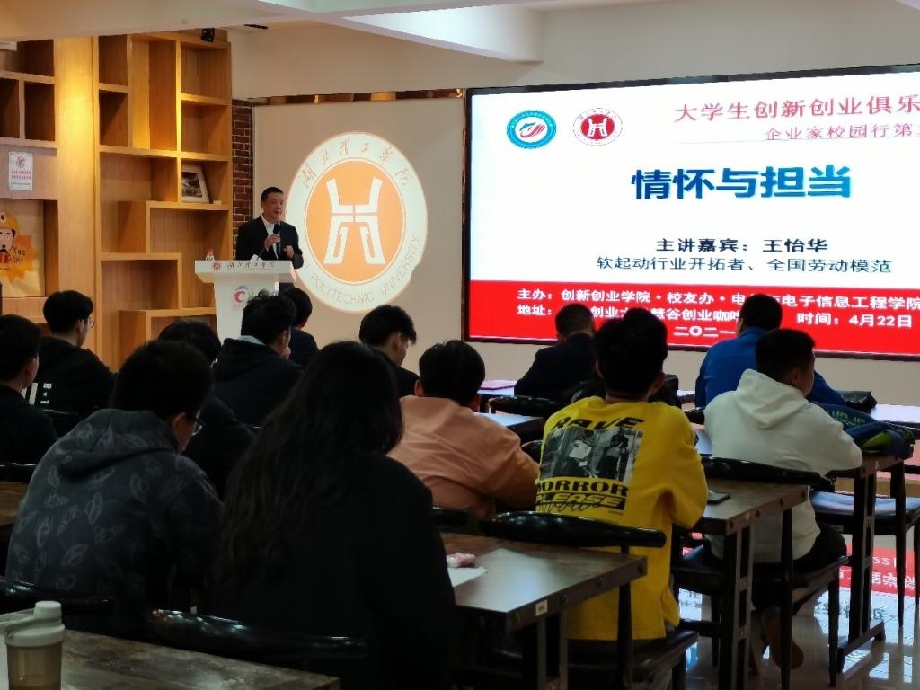 4月22日下午,“企业家校园行”暨“校友校园行”第二十三期开讲。特邀我校1987级校友、全国劳动模范、大禹电气科技股份有限公司董事长王怡华返回母校做“情怀与担当”主题讲座。活动由创新创业学院、校友办公室、电气与电子信息工程工程学院主办。毕业生就业工作处处长刘显,校友办主任韩幸,电气学院党总支书记徐滤非,副书记王再明,电气学院部分班主任、辅导员以及各年级学生代表参加了本次活动。活动由电气学院党总支书记徐滤非主持。