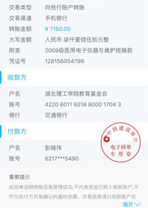 2009级医用电子仪器和维护班共有校友26人,其中班长惠辉在武汉新型冠状病毒肺炎疫情爆发以来,时刻关注武汉局势的发展变化。在听到志愿湖北医疗队的消息后,他积极主动报名,但因为单位被定为新冠肺炎定点医院而没有成行。之后他通过班级微信群发起捐款倡议,同学们在收到倡议书之后纷纷慷慨解囊,积极为母校贡献自己的绵薄之力,最终26名同学共筹集到7150元。随后他主动联系班主任胡增裕老师咨询捐款具体流程,并由彭晓伟负责转账,希望以微薄之力,助力学校疫情防控工作。